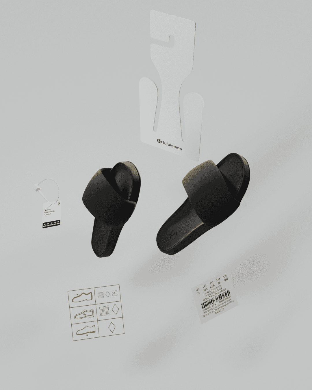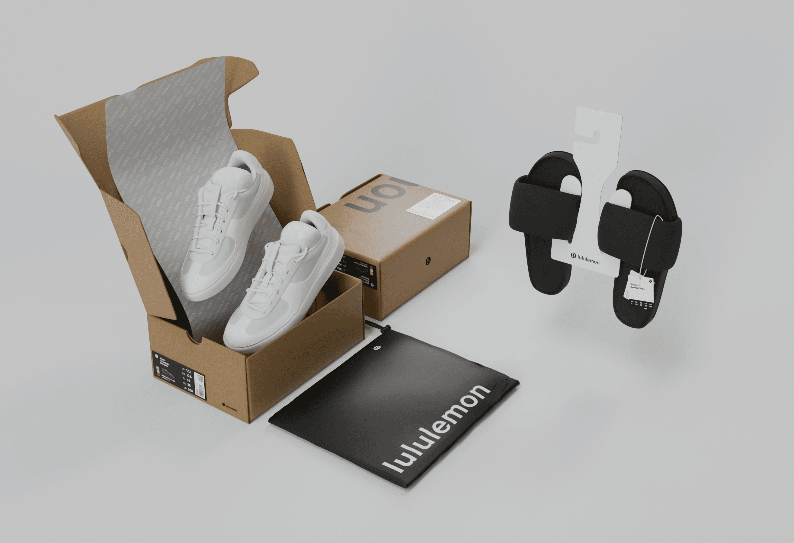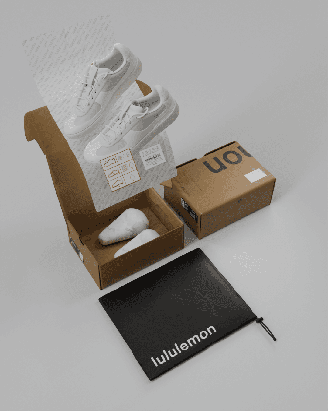 Lululemon commissioned me to create high-fidelity 3D visuals for their current retail packaging suite. Working from their print production files, I developed accurate 3D models of their core packaging and labeling assets. I also processed and retopologized high-resolution 3D scans of footwear and modeled their slide sandals from product imagery to complete the collection. The final composition was designed to give stakeholders a clear, tasteful understanding of the full packaging ecosystem, and the imagery was featured in a key internal presentation.