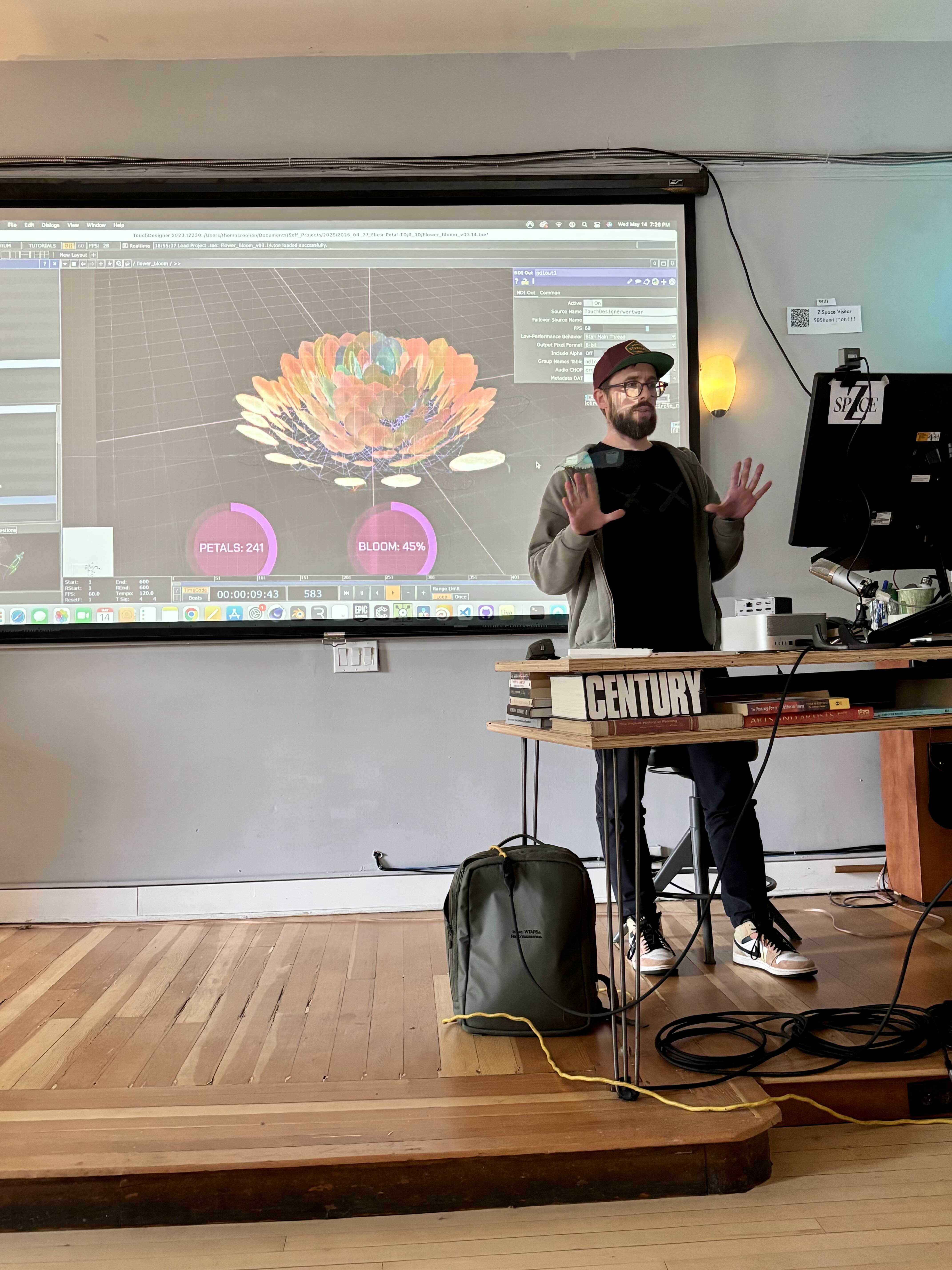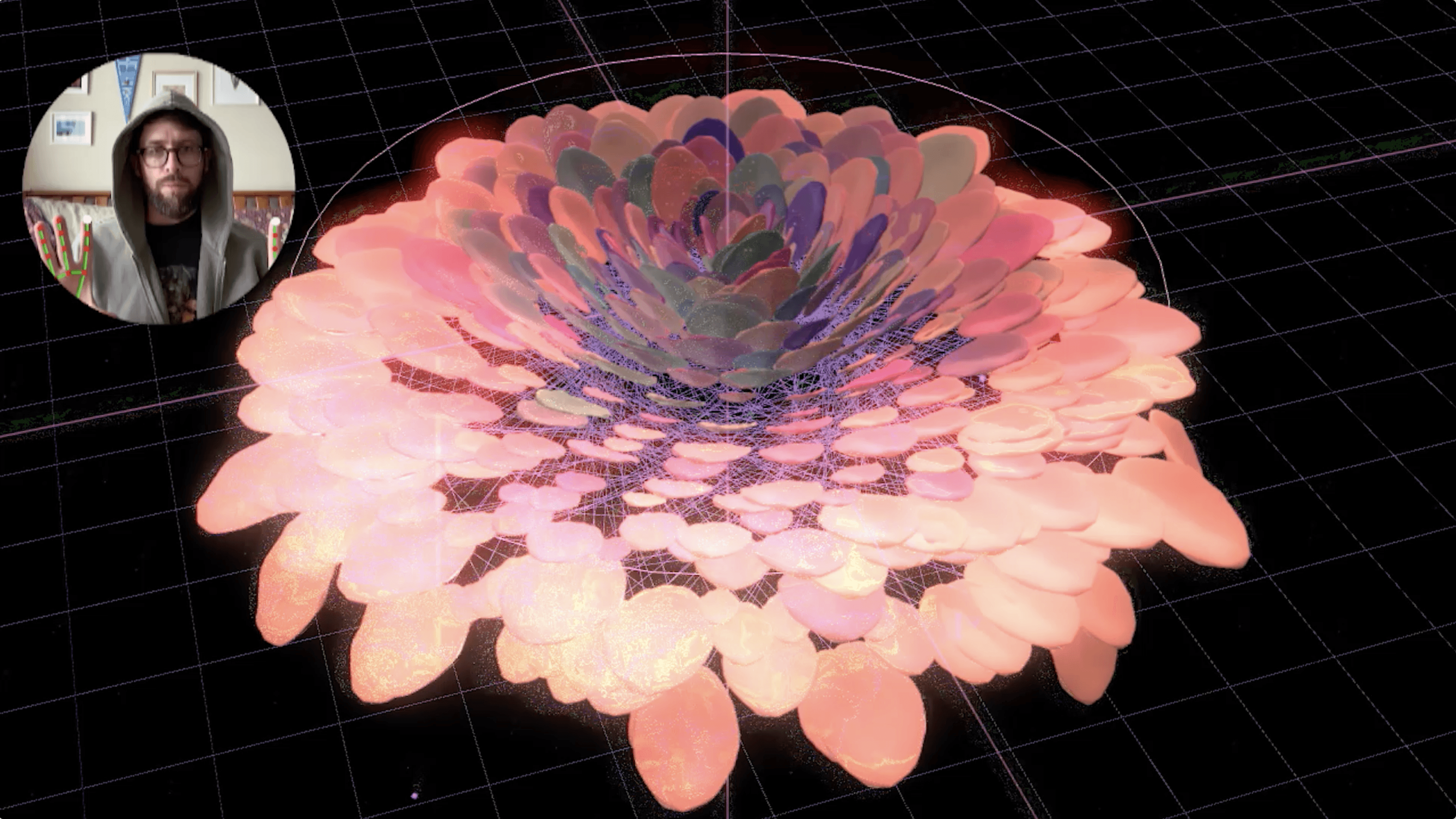 I took this opportunity to create a real-time interactive installation built in TouchDesigner. Using Mediapipe tracking data, I created a system where hand gestures drive a procedural phyllotaxis algorithm. The result is a 'digital garden' that blooms and reacts instantly to the viewer's physical movement.